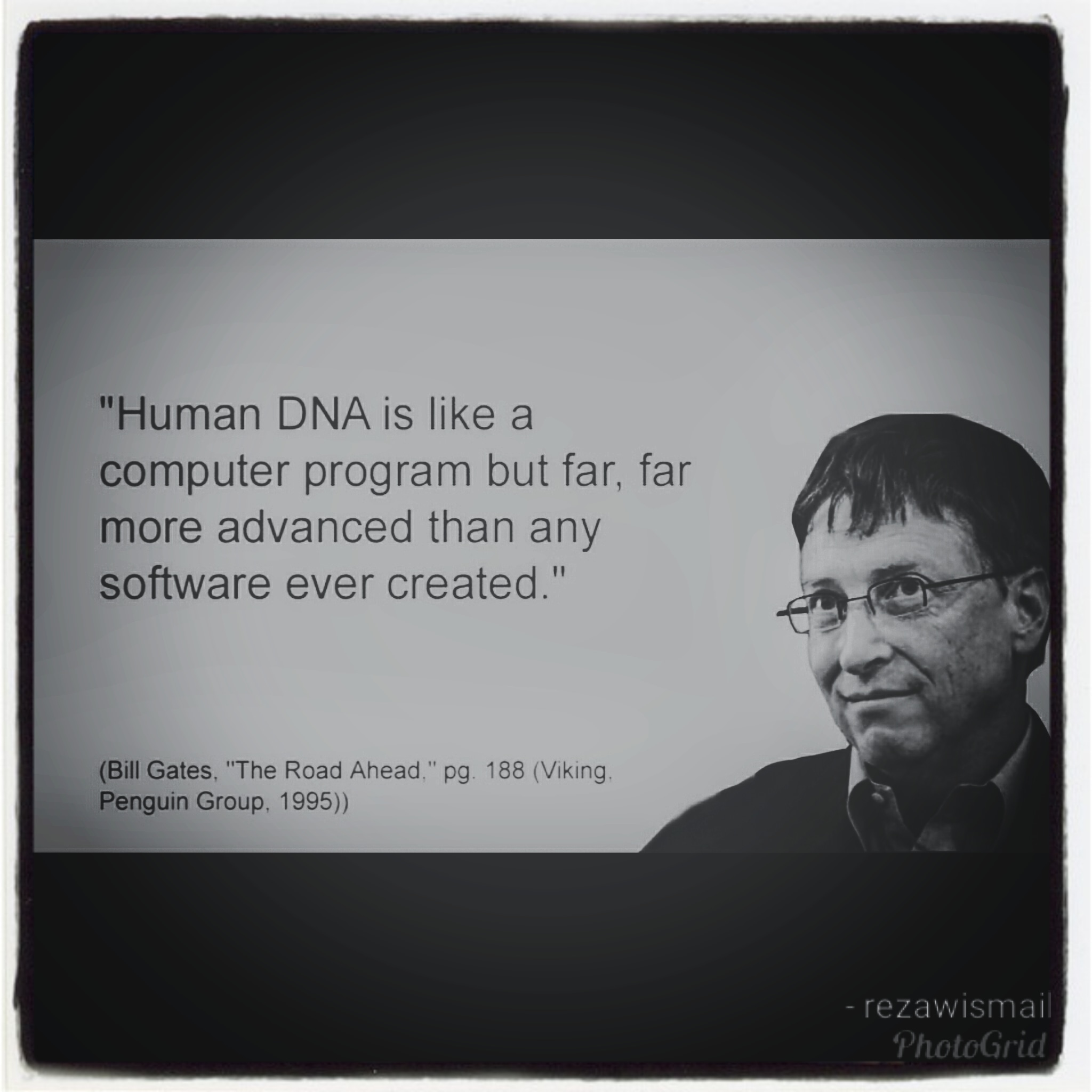 Liat aja DNA kita, memiliki kode seperti bahasa pemrograman mengandung informasi yang tersusun dengan pengaturan khusus, bersyaratkan kombinasi isomer optimal yang tepat dari jenis asam amino bersisi sama jadi protein yang semua ikatan peptidenya harus menyeluruh, sehingga ada DNA untuk mahluk jadi bisa hidup berkembang biak mereplikasi diri secara biokimia… ~